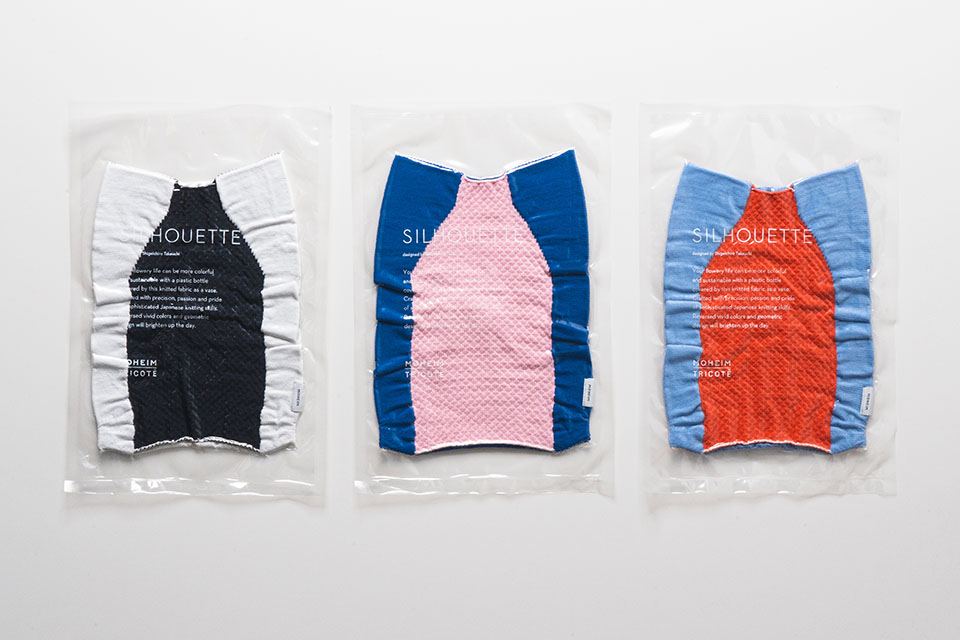 Knit materials are basically “flat.” Furthermore, the packaging of SILHOUETTE is vacuum packed, which further emphasizes its flatness. I came up with this name because I wanted people to feel the series of events that occur when a flat knit is transformed into a three-dimensional form by covering something that would normally be thrown away, and the silhouette emerges.